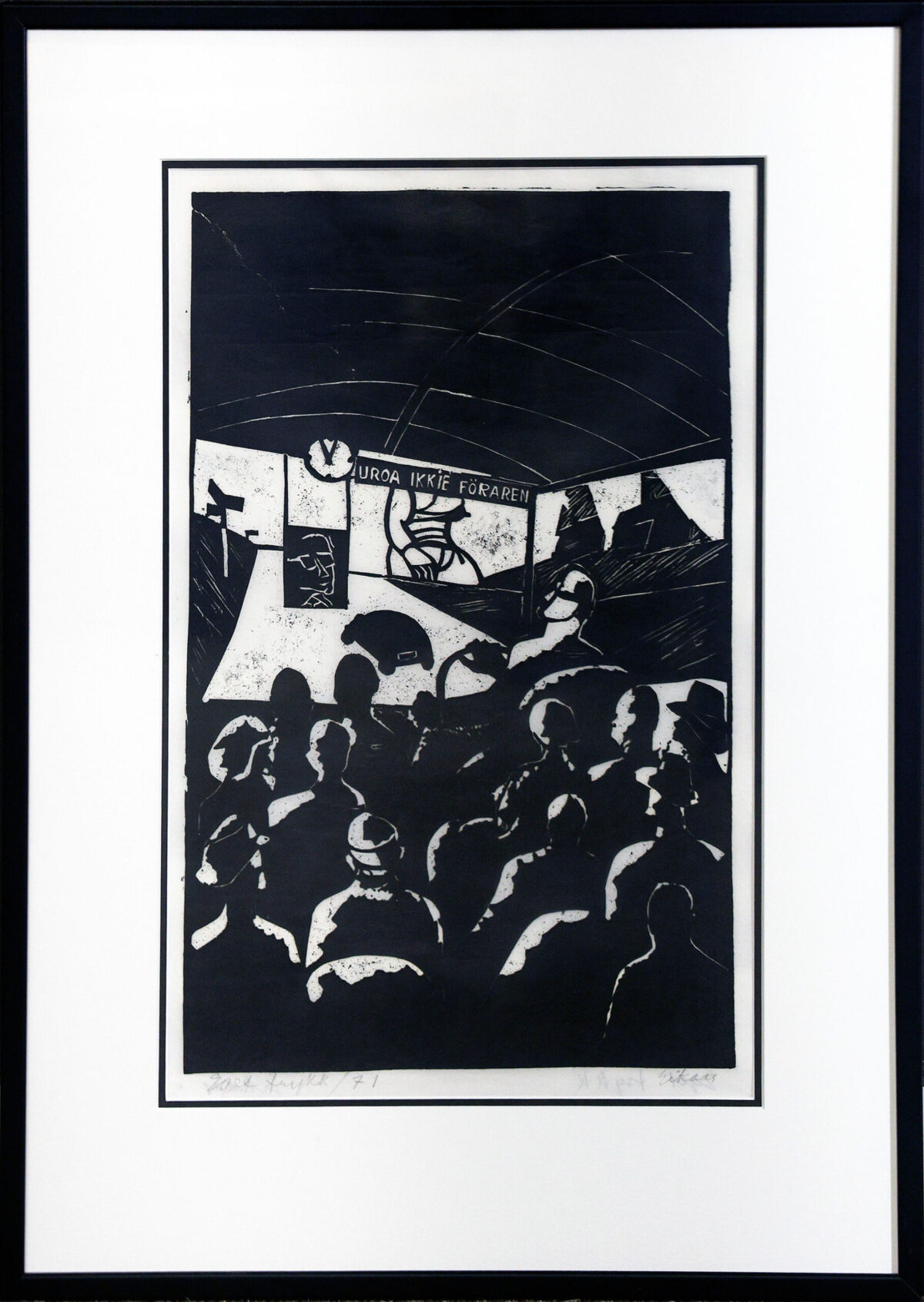 Linosnitt. 1971. Eget trykk. 49×30 cm, signert nede til høyre. Innrammet. I tillegg til prisen kommer 5% Kunstavgift.